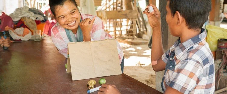 Disability worker Phearom helps perform basic speech therapy. Photo: Hugo Sharp